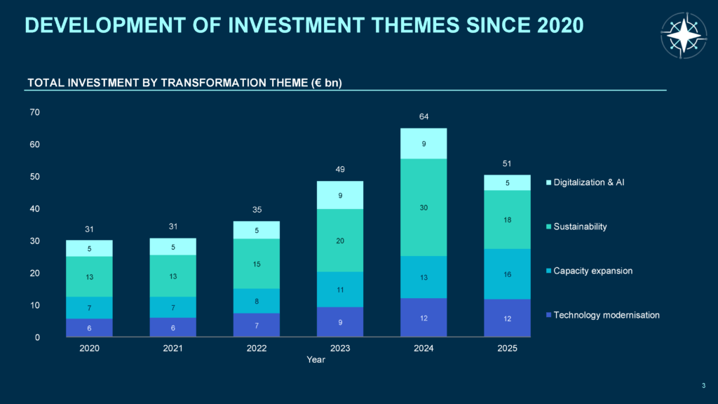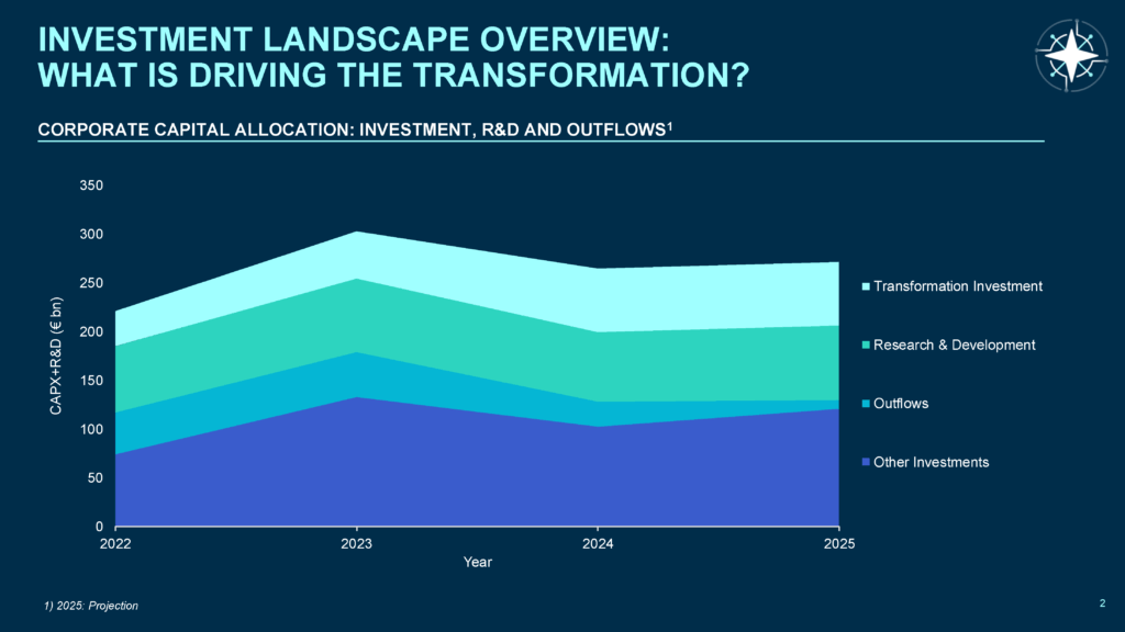 It covers the full transformation taxonomy, including sustainability and digitalisation investments that are typically embedded in or excluded from reported capex figures.