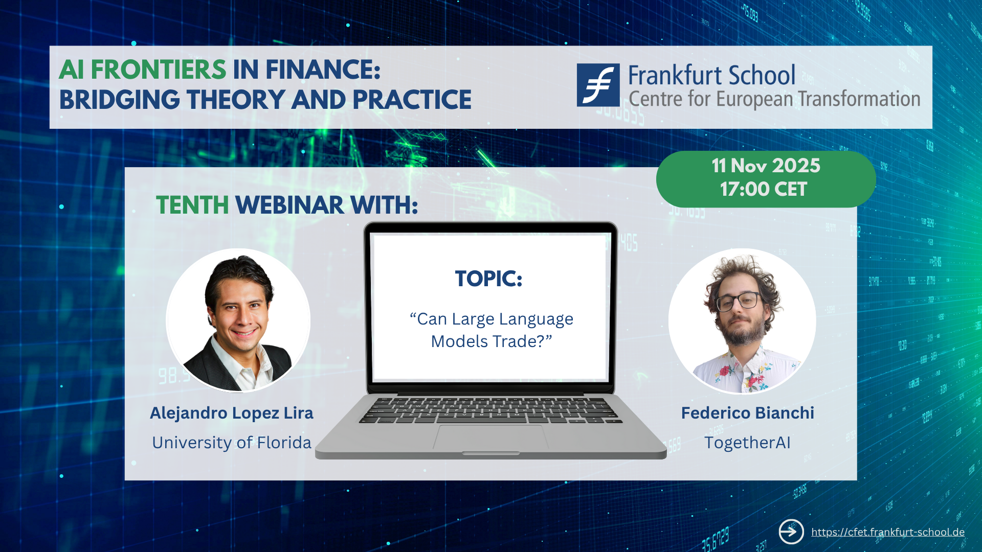 We invite you to register for Session 10 of our AI Frontiers in Finance Webinar on 11 November 2025. In this session, Alejandro Lopez Lira from University of  Florida, will present his research. We look forward to welcoming you to another engaging and informative session!